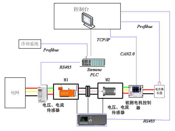 系統采取先進的四象限ASD深弱磁永磁同步電機驅動器作為負載控制器,負載能量回收采用交流母線回饋的模式,利用ASD的逆變裝置控制負載電機完成加載及負載的調節。整個試驗系統含ASD控制系統和計算機控制的測量系統、PLC控制系統等,系統技術先進、可靠性高、準確度高、重復性好,屬于節能型試驗系統,具有優良的性價比。
